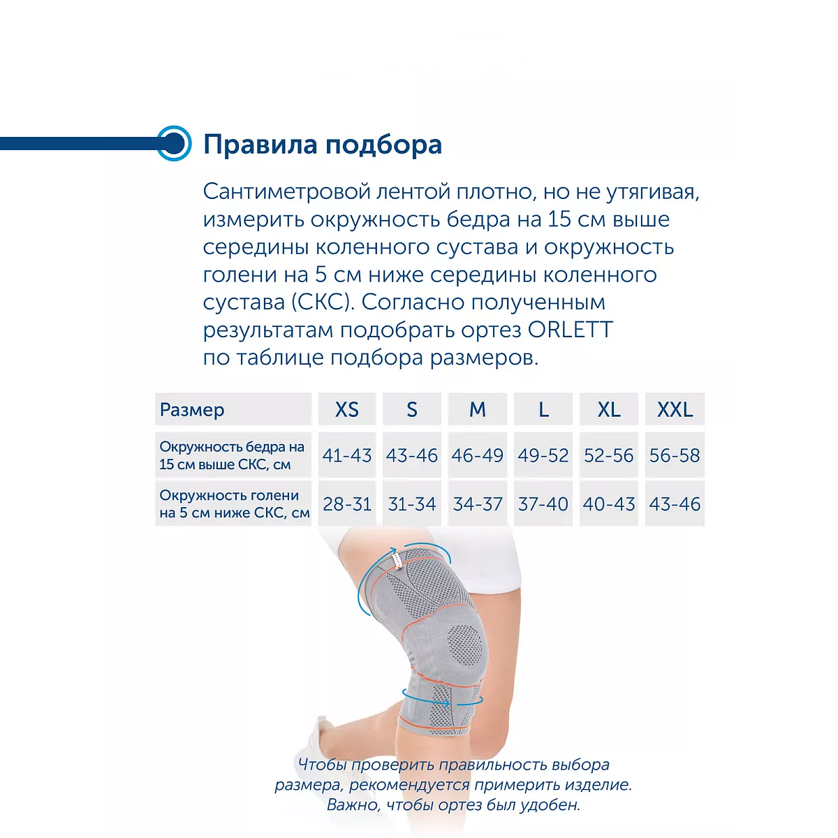 Для правильного выбора размера динамического ортеза ORLETT DKN-203 на коленный сустав необходимо сантиметровой лентой плотно, но не утягивая, измерить окружность бедра на 15 см выше середины коленного сустава и окружность голени на 5 см ниже середины коленного сустава. Согласно полученным результатам подобрать ортез по таблице подбора размеров.